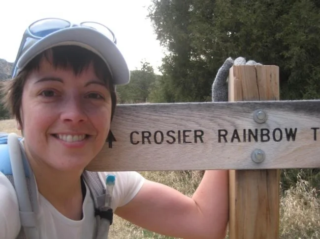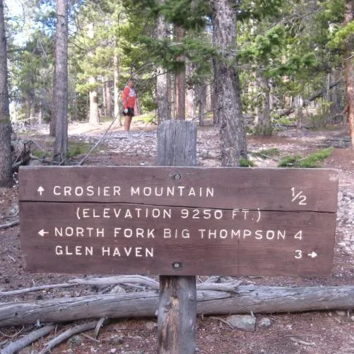 The trail starts with a few short switchbacks up a meadow, then a few more switchbacks in a forest, and then flattens out a bit in a meadow before climbing again. At about 2.5 miles, you reach a really cool area with lots of boulders and rock formations, followed by a short downhill section before the final climb up Crosier Peak. Near the top, I fell into step with Brian, and talking about the upcoming Bighorn 50-mile race, which we're both running in a few weeks, the time flew by and we soon found ourselves at this sign, which marks the three-way split between the summit trail, the Garden Gate Trail, and the trail that descends toward the Glen Haven and Rainbow trailheads.
