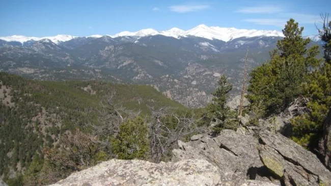 The summit, at 9,250 feet, isn't all that high, but it offers an impressive vista of higher peaks. Panning left to right, you can see Mt. Meeker, Longs Peak, Storm Peak, McHenrys Peak, Thatchtop, Taylor Peak, Otis Peak, Hallett Peak, Flattop Mountain, Stones Peak, Sundance Mountain, Mt. Chiquita, Ypsilon, Fairchild, Mummy Peak, Hagues, Dunraven, and Stormy Peak.
