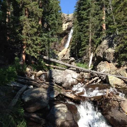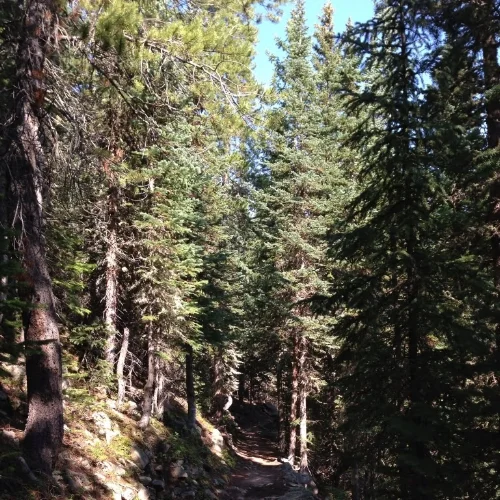 A forested trail between Ouzel Falls and the higher altitudes of Ouzel Lake.