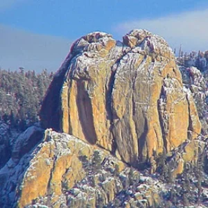 All the while, I was thinking about what to do next. I knew there was one bear behind me, so if the bear in front of me didn't keep moving, which direction could I go? The rock formations of Thunder Buttress, the Pear, and the Lens climbed steeply to my left, while to the right, trees grew densely, leading down a steep hill with uneven terrain. It was the best of bad options, but would be tough going if I actually had to go that way.