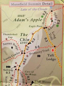 Planning this little adventure was made a lot easier by an awesome map of Mount Mansfield trails (small excerpt reproduced at left) recently published by the Green Mountain Club (you can purchase it at their website, and if you ever climb Mansfield I highly recommend that you do!) The map gives some topographical info, trail mileage, and driving directions to each of the trailheads. Since I didn't have a lot of time, this was the route I decided upon:
