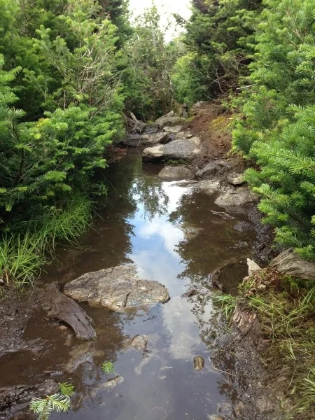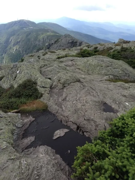 The summit ridge along the Long Trail heading south. I love all the alpine vegetation here, and the tiny pools that have emerged in low spots in the rocks.