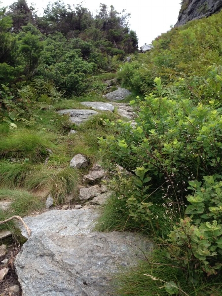 This sign appears at the spot where the Laura Cowles Trail hits the Long Trail. At this altitude, the plants grow very slowly and are fragile, and so numerous signs like this one encourage hikers to stay on the trail and as much as possible, walk on the rocks rather than on fragile vegetation.