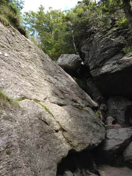 The Profanity Trail is apparently a "bad weather bypass" for this section of the Long Trail, but after having hiked on it I'd say it would probably not be a great trail to descend in bad weather, for the same reason as the Laura Cowles Trail: it is brutally steep, and I can only imagine that in bad weather, the water would come sluicing over the rocks in a way that would keep any hiker from seeing very well. It would also be quite slippery! But in a lightning emergency, it would be a quick trail to get lower than Mansfield's summit in a hurry. Especially if you fall. And if you survived the fall, you'd probably be spouting a lot of profanity...maybe that's how this trail got its name?
