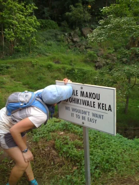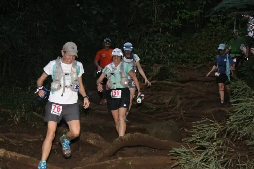 The four of us ran together for a while, to the top of the hill. But on the descent into Paradise Park, it was clear that Sarah was struggling, feeling more and more ill. In any race, as the night grows darker and there is less ambient light to help the human brain orient itself in space, it is easy to get nauseated. It has nothing to do with one's training level or fitness; the most accomplished runners have been felled at one time or another by motion sickness in this way. The darkness of the Hawaiian jungle is particularly profound, and surrounded as we all were by the bouncing light beams of our headlamps, it's amazing all of us didn't throw up over the edge of the trail.