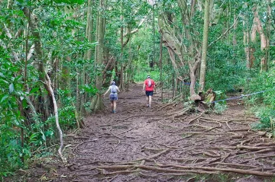 On the way back up the hill from Nu'uanu, at every switchback we expected to see Sarah making her way down. With each headlamp in the distance, our hopes would rise, only to realize when the runner was right in front of us that it was someone else. It wasn't until we climbed up to the rooty maze of Center Trail and turned toward Nature Center that we began to worry that Sarah might be seriously ill. And Sarah wasn't the only one; on Loop 3 the ranks started to feel very thin. The cheery greetings from other runners became less and less frequent as more runners dropped.