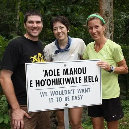 Sarah (front) leading Marian and me (rear) into the Nu'uanu aid station Photo by Andrea Stout.